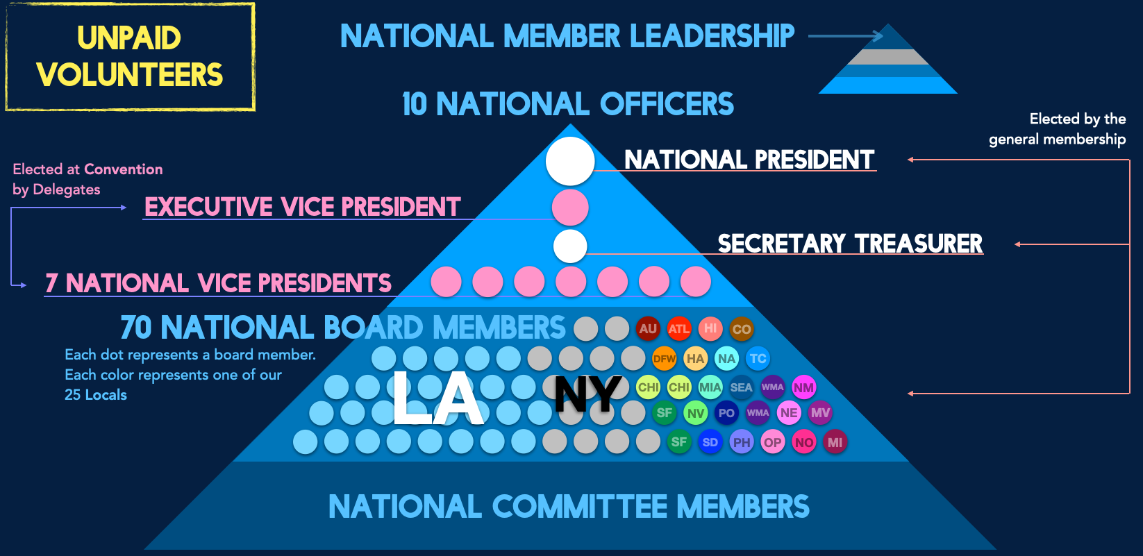 Every one of our 25 Union Locals elects members to the National Board and as Convention Delegates who elect the 7 National Vice Presidents at the biennial Convention.